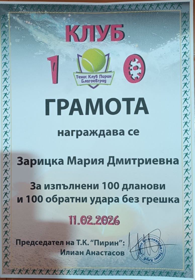 Уважаеми бивши и настоящи възпитаници на Тенис клуб „Пирин“, с тази публикация, искаме да направим галерия от снимки на вашите грамоти Клуб 100, които сте получили. За нас, треньорите, ще бъде много интерсено, надявам се и за вас, в исторически план да се запознаем с изменението на оформлението на грамотата и да видим първият носител и всички вас, които сте заслужили да я получите.